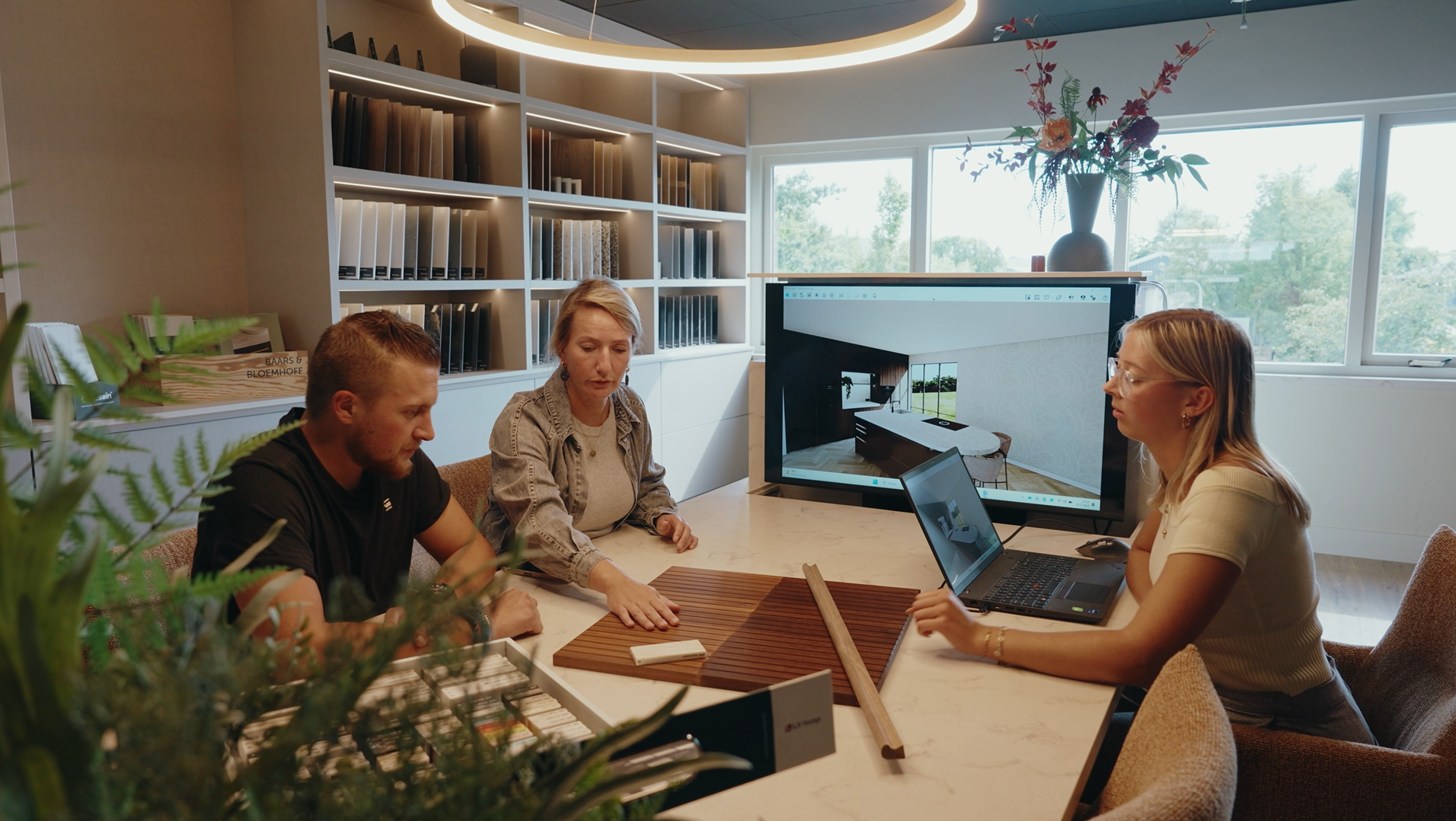- Nadat uw wensen zijn besproken en de afmetingen duidelijk zijn, heten we u van harte welkom in onze showroom. Hier gaan we aan de slag met het ontwerpen van de indeling in onze 3D-tekenprogramma's. We bekijken alle mogelijke opties om tot het beste resultaat te komen. Zodra de basis is gelegd, kunnen we verder gaan met het specificeren van de details.